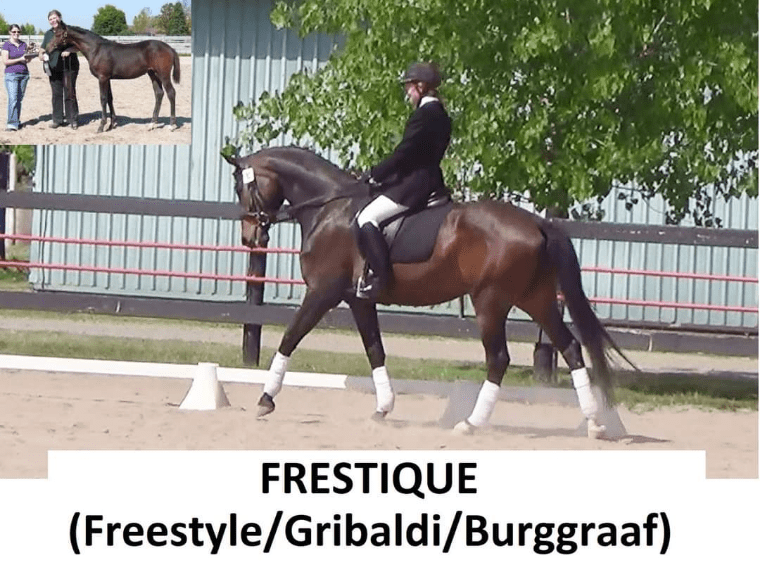 Frestique is by the super producer Freestyle out of premium mare Unique who is now deceased. Unique was high score mare across Canada the year of her inspection and produced 5 fillies and 2 colts for us. Unique was out of an imported Ster KWPN mare (Olivia (Burggraaf/Duc de Normandie) and Grand dam Biminente and Great Grand dam Viminente are both earned their keur, pref and prestatie awards. In simple terms this mare is out of a really good maternal family and I’m thrilled she came back to me after a number of years as a performance horse. She had a beautiful colt by His Querido in 2021 now competing in dressage (Zeberdee VDB), a His Querido filly in 2022, a Special D filly in 2023, a His Querido colt in 2024 and a Springbank II VH filly in 2025. She was again confirmed in foal for a 2026. She’s blessed us with great fertility and quality foals. She was presented for inspection with foal at foot and received an impressive 7.66 making her a premium mare. The small photo in the top corner is her as a foal and receiving her award as the winner of the CWHBA foal futurity.